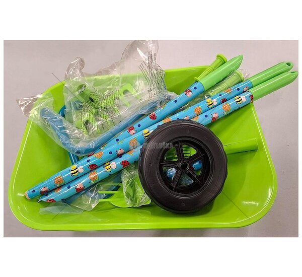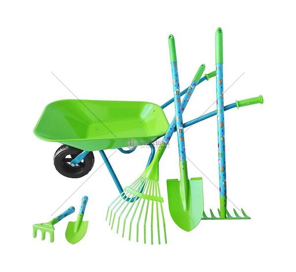 Sada 6 ks zahrnuje ruční zahradní nástroje a kolečko s korbou, vše pro dětské ruce a přiměřenou fyzickou zátěž. Nástroje jsou vyrobeny z kombinace kovu a plastu, zahradní kolečko je kovové. Sada pokrývá základní zahradní činnosti: kopání, hrabání, přesazování i přepravu zeminy nebo materiálu.