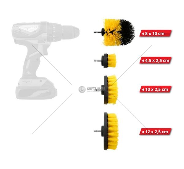 Sada je složena z kartáčů rúzných tvarů a velikostí, které zajistí úklid domu i osobního automobilu. Ploché kartáče mají průměr 4,5; 10 a 12 cm s délkou štětin 2,5 cm a praktický tvarovaný kartáč průměru 8 cm, délky 8 cm s délkou štětin 3 cm.