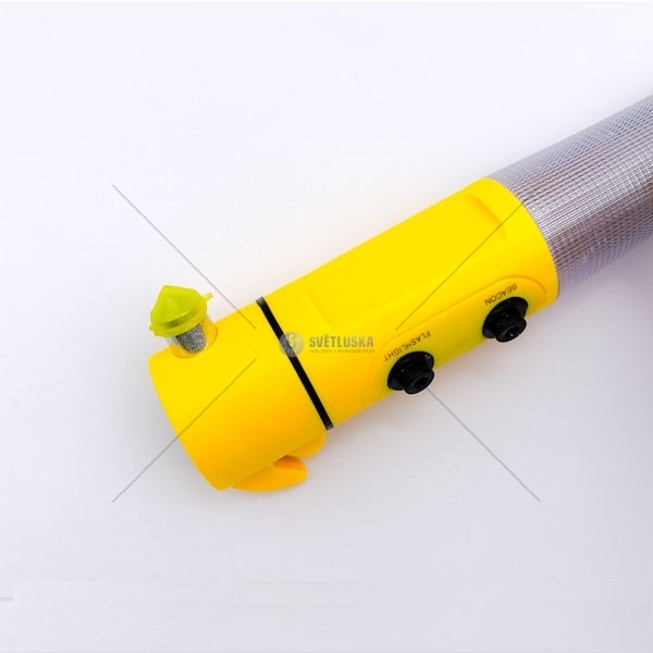Svítilna má 4 funkce: 1) blikající nouzové světlo - červená, 2) led svítilna, 3) tříštivý hrot na sklo, 4) nůž na řezání pásů, Svítilna má také vestavěný magnet, který umožňuje připevnění ke kovovým povrchům. Svítilna je vodotěsná délka: 19 cm napájení: dvě AA baterie - nejsou součástí balení- Hmotnost (kg):0,13