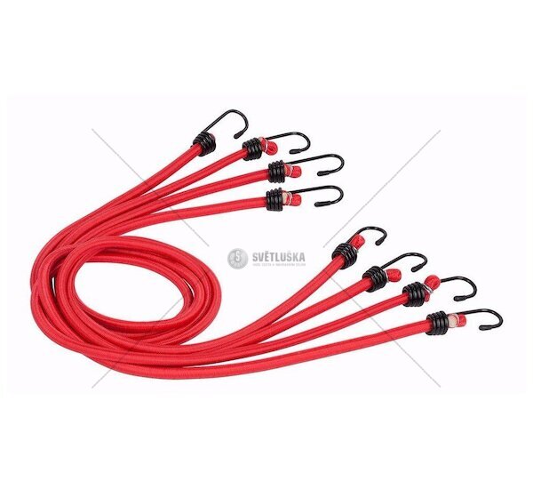 Praktické upínací gumy s ocelovými háčky pro bezpečné upevnění nákladu na jízdní kolo, rudlík či jiné nosné konstrukce. Upínací gumy o průměru 8 mm a délce 100 cm nabízejí spolehlivé uchycení předmětů s maximální nosností 7 kg. Balení obsahuje 4 kusy.